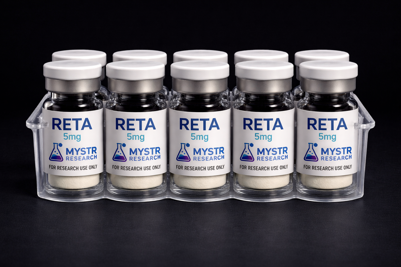 At MYSTR Research, our Reta triple agonist peptide bulk kit is supplied in bulk research kits containing ten (10) lab-grade, lyophilized vials, intended solely for controlled in-vitro research. This compound is often used in experimental models that explore multi-pathway signaling activity and interactions across complex peptide receptor systems. Because of its stability and purity, researchers select the Reta triple agonist peptide when studying cellular behavior, receptor response, or laboratory-based metabolic modeling. This product is strictly for laboratory research use only.